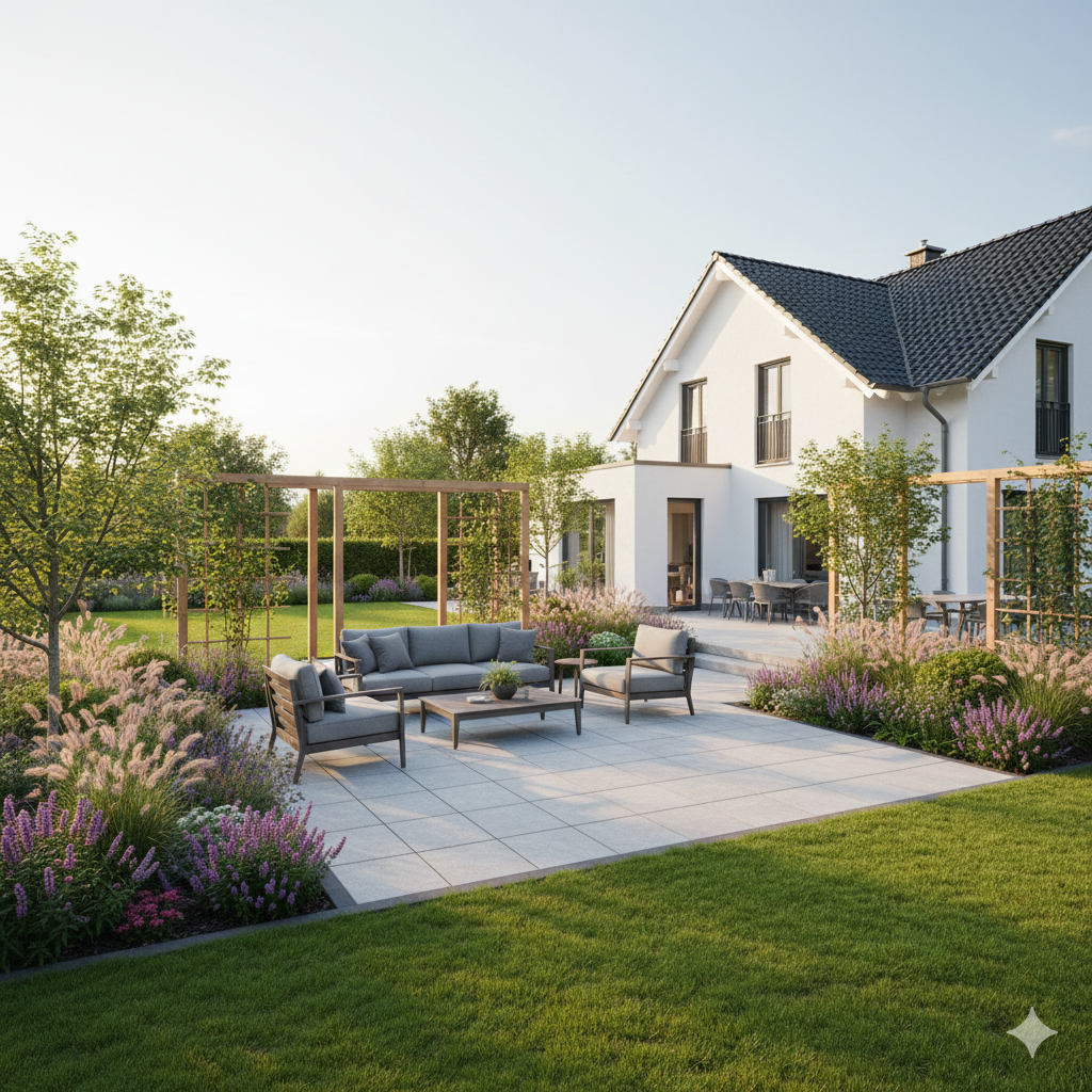 Eine Terrasse erweitert den Wohnraum nach draußen. Wir bauen Terrassen aus Stein oder anderen langlebigen Materialien – stabil, pflegeleicht und perfekt abgestimmt auf Haus und Garten.